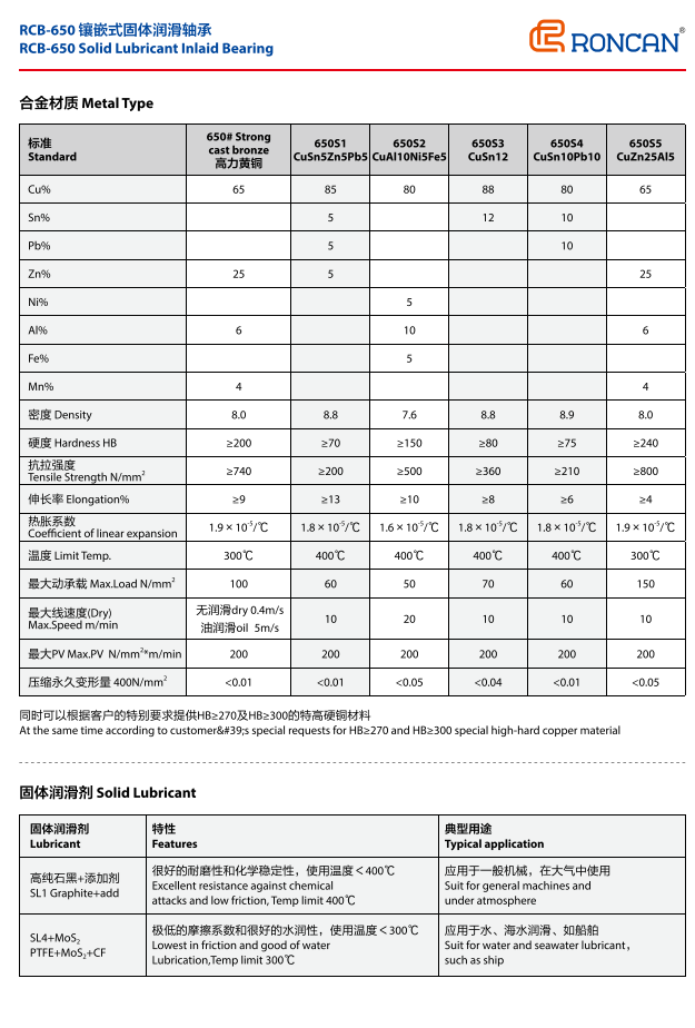 The RCB650 is a universal basic product, regardless of high pressure, low pressure, high temperature, low temperature, oil lubrication, oil free lubrication or water lubrication. All can be applied. The matrix of the product is high force brass, which is twice as hard as the ordinary copper sleeve. The wear resistance is more than doubled. Therefore, it can be used in continuous casting machines, rolling mills and conveyors in the metallurgical industry. Also used in plastic injection molding machine mold locking mechanism, extrusion mechanism. The automatic switch of high voltage electricity, the lifting support part of construction machinery, and the arc door support of water conservancy project. Pulley and drive wheel parts. There are paper machine drying track, automobile mold, ship anchor sliding parts, etc.
