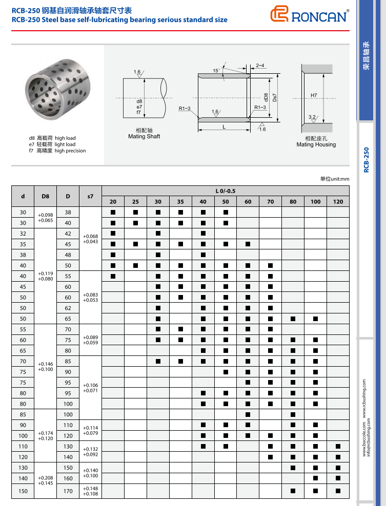 RCB250則在 RCB200的基礎(chǔ)上進(jìn)行了改良,以固體潤滑劑嵌入替代了原有的披覆方式,使得產(chǎn)品在使用過程中提供了源源不斷的潤滑源,從而達(dá)到免維護(hù)的目的。